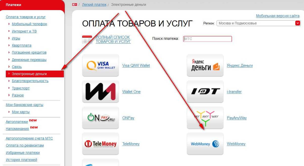 МТС также позволяет перечислять финансы на многие популярные электронные кошельки: