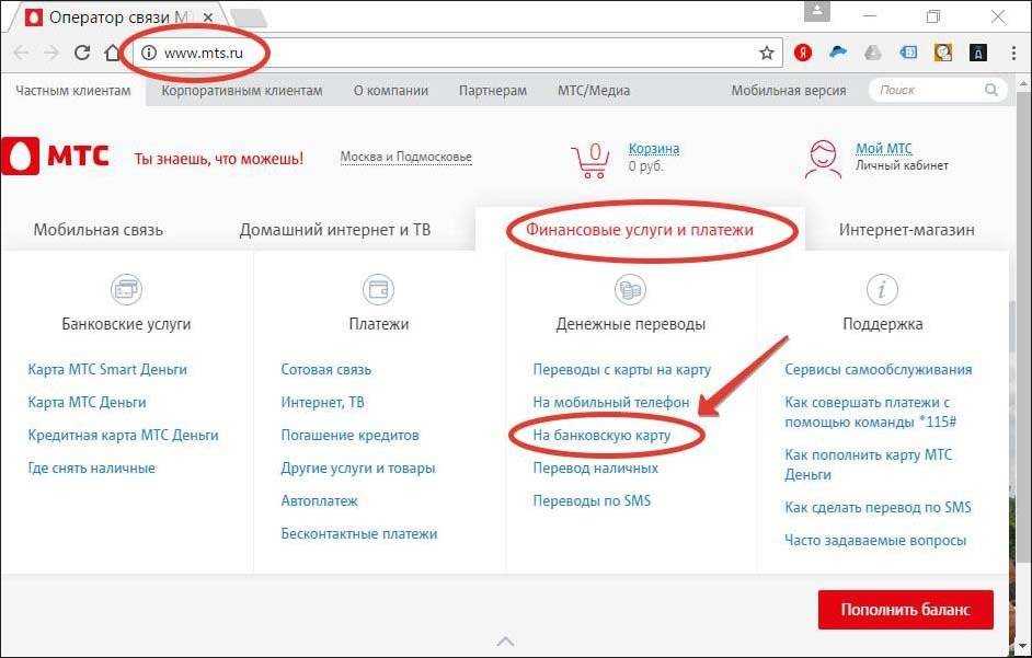 Перевести деньги с мобильного счета на банковскую карту можно через несколько сайтов МТС: