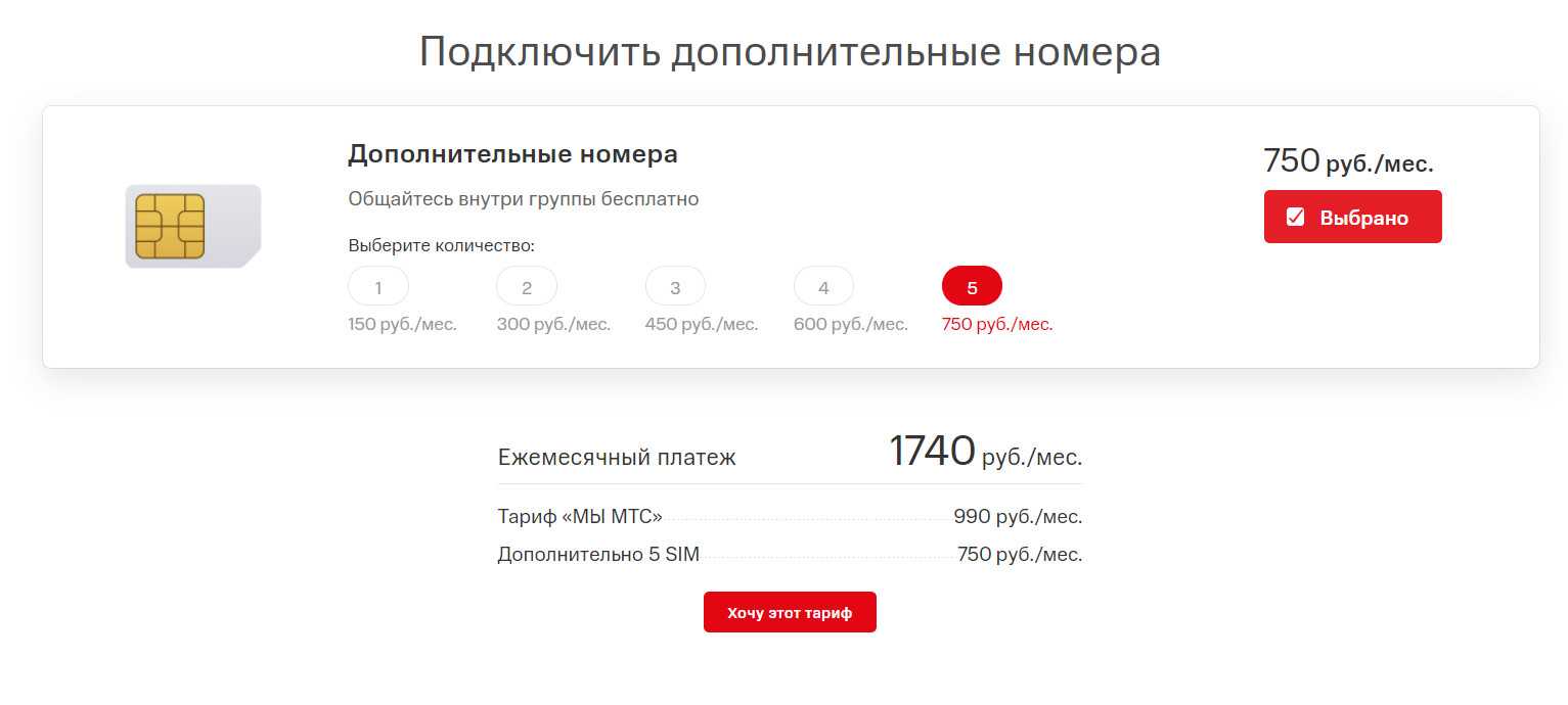 - Выбрать количество дополнительных номеров – подключить можно только абонентов МТС.
