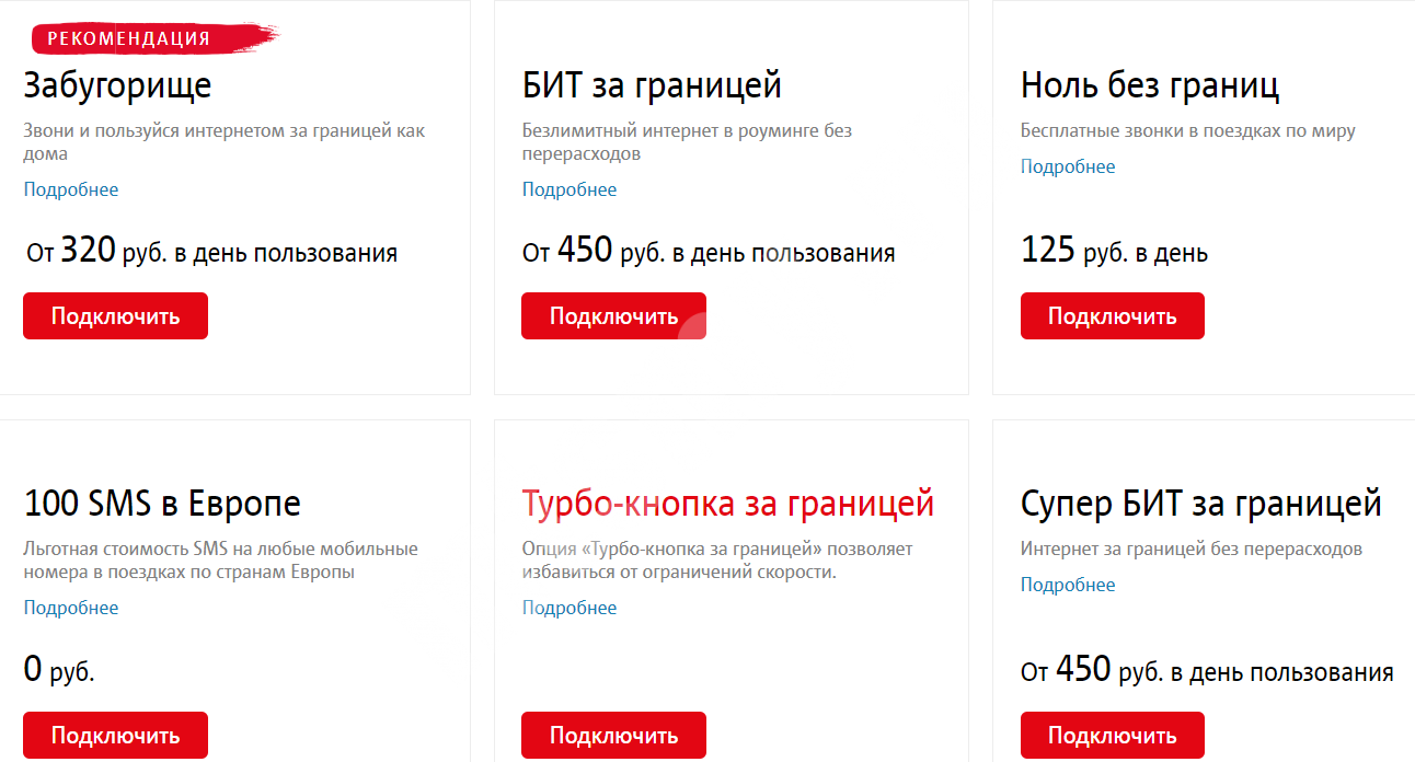 Чтобы сэкономить на балансе телефона, если вы не воспользуетесь одним из предложенных выше предложений, вы можете активировать дополнительные услуги перед поездкой. Для национального роуминга оператор предлагает 5 таких вариантов. Чаще всего их приходится использовать после того, как закончились основные пакеты.