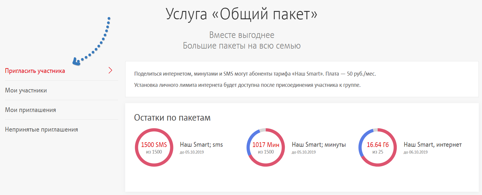 Делитесь пакетами в приложении МОЙ МТС (на странице тарифа кнопка «Управлять участниками») или в Личном кабинете (кнопка «Поделиться пакетами»). Или наберите *918*1*7ХХХХХХХХХХ# с номером абонента, с которым хотите поделиться.