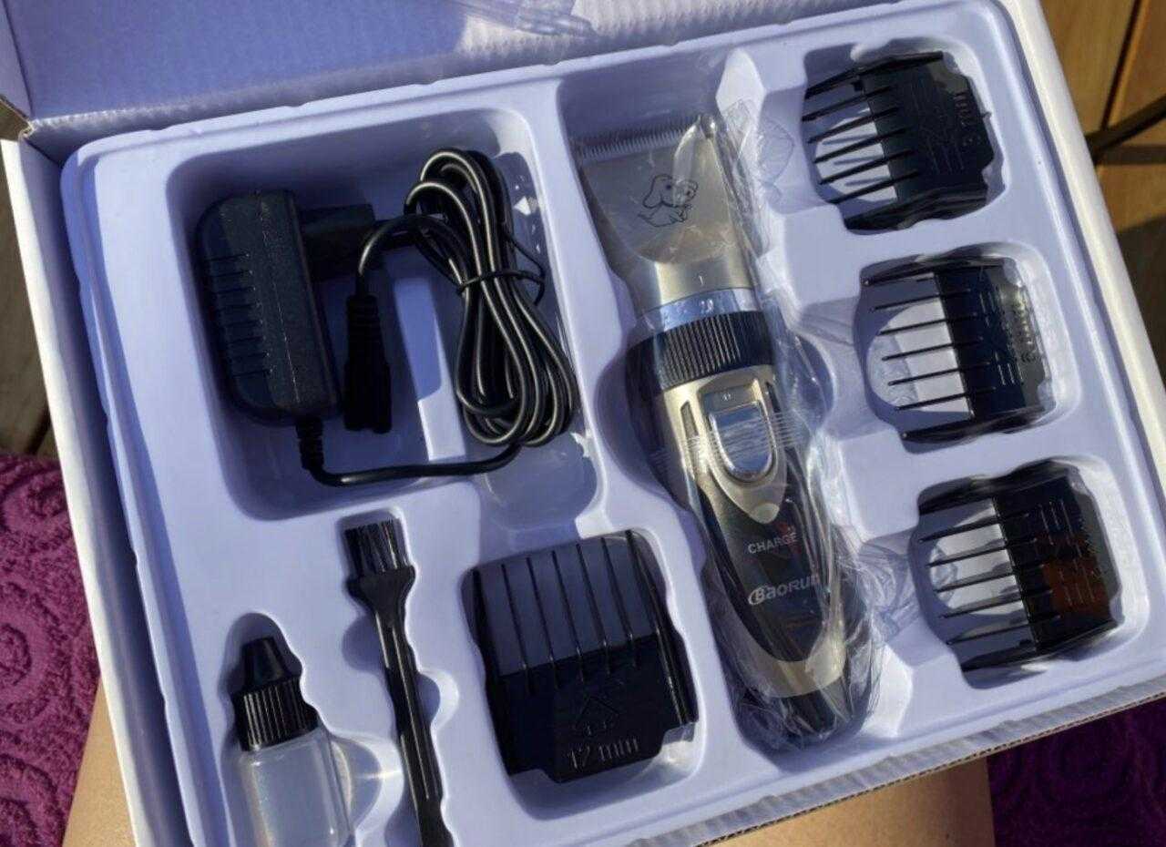 Универсальная машинка беспроводного типа подойдет для ухода за шерстью собак и кошек – плюс, так как не исключено появление в доме кота. В набор входят: сам триммер, адаптер сети, 4 направляющие расчески, щеточки для очистки и масло.