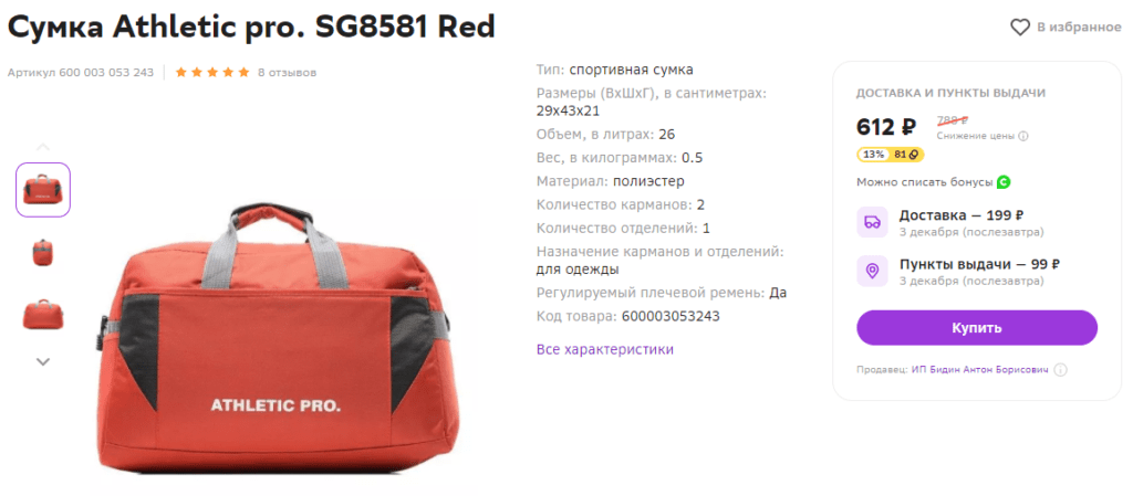 Сумка пригодится не только спортсмену, но и любителю путешествовать налегке. При покупке в «Сбермегамаркете» вы получите ее уже через три дня. Правда, доставка будет бесплатной только при активной подписке Сберпрайм.
