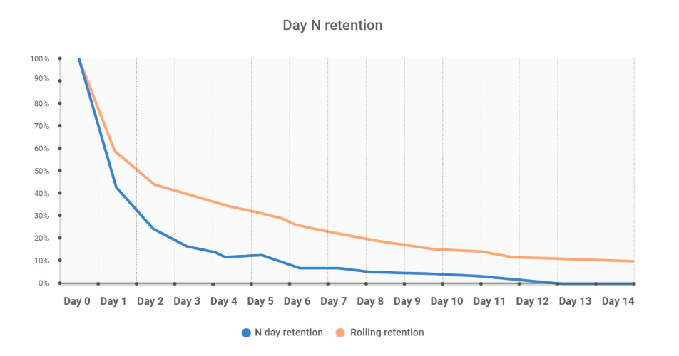 Retention – это очень важный показатель в аналитике приложения для смартфона. Он определяет процент активных пользователей после первого запуска проекта. Retention рассчитывает статистику на 1, 7, 30, 60, 90 день и т.п.