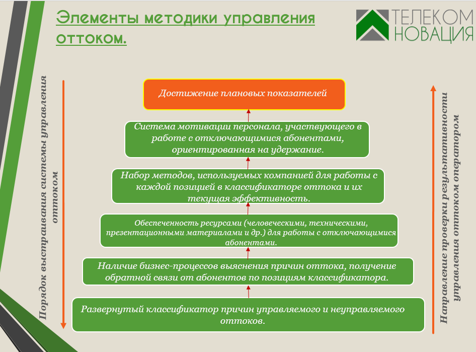 В основе нашей методики удержания абонентов лежит системный подход, который отражает приведенный ниже рисунок. Сверху вниз демонстрируется порядок анализа элементов управления оттоком, а снизу вверх — порядок её проектирования. Грамотно выстроенный порядок всех этих элементов приводит к достижению плановых показателей по снижению оттока.