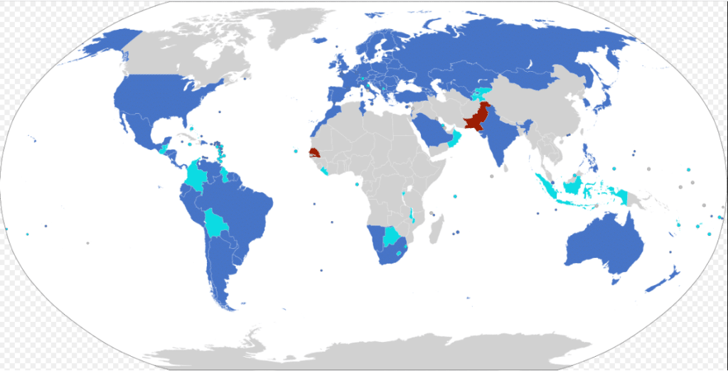 Не окрашены государства, лидеры которых не приняли условия конвенции, а красным выделены страны, которые пока не присоединились к соглашению.