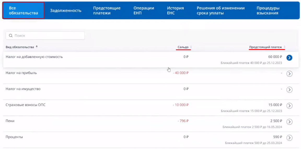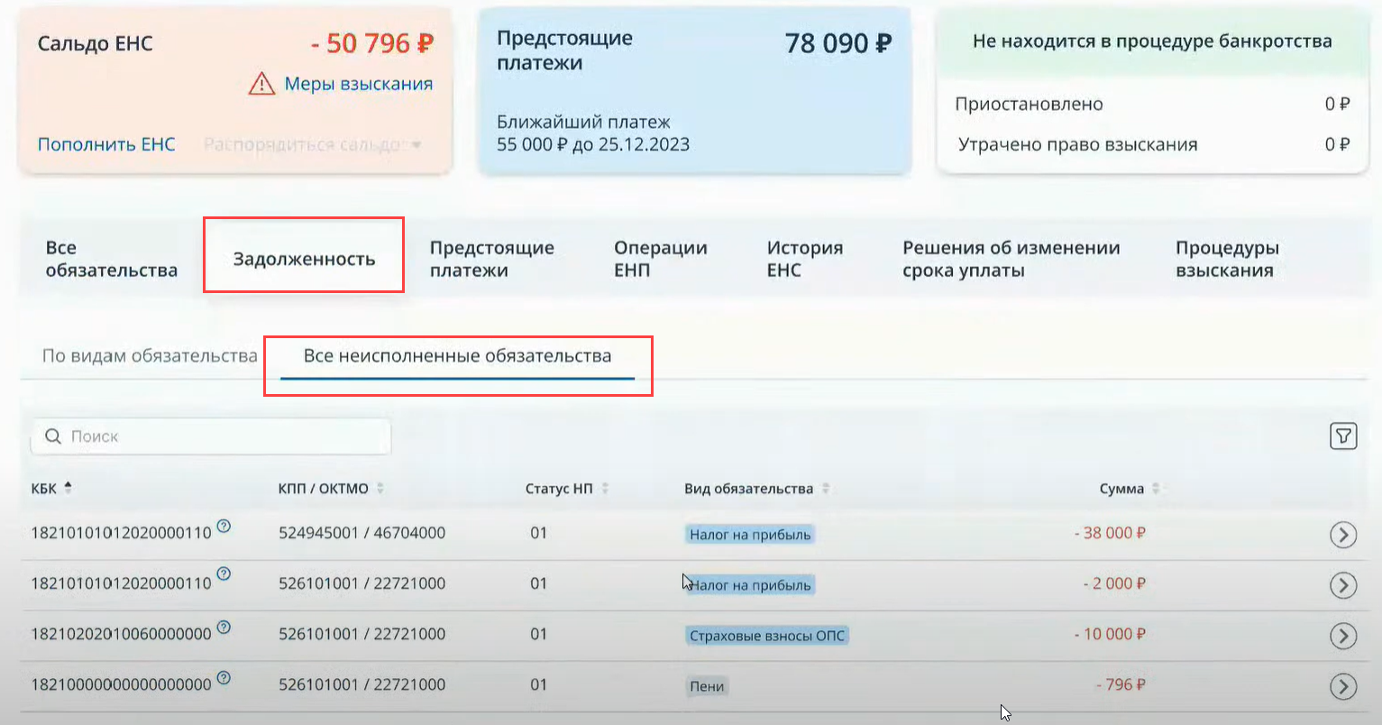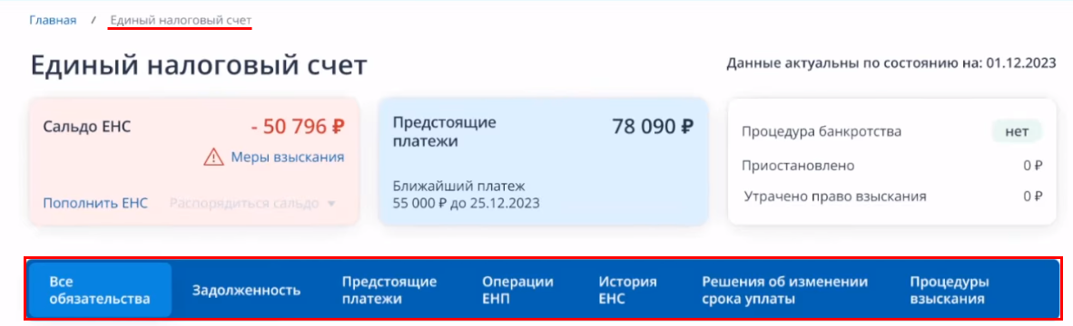 Маркер процедуры взыскания также отражается и в блоке Сальдо ЕНС.