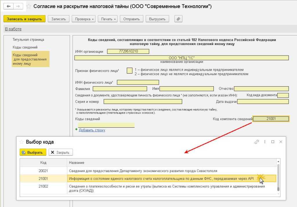 Для работы с личным кабинетом ФНС пользователь 1С может направить в ФНС согласие на раскрытие налоговой тайны в отношении информации о состоянии единого налогового счета налогоплательщика по данным ФНС, передаваемой через API.