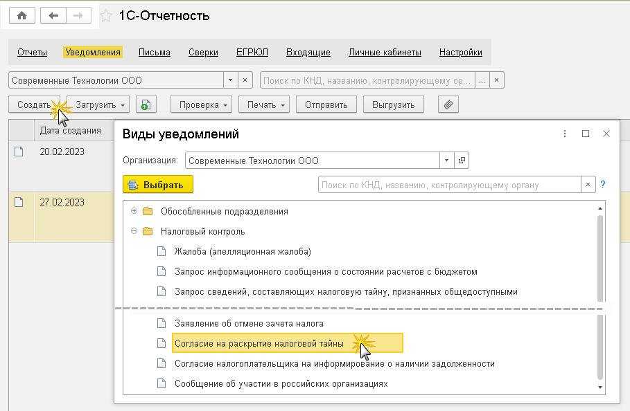 В «1С:Бухгалтерии 8» редакции 3.0 указанная форма доступна в разделе Уведомления единого рабочего места 1С-Отчетность. По кнопке Создать в открывшемся списке доступных уведомлений следует выбрать Согласие на раскрытие налоговой тайны из папки Налоговый контроль (рис. 2).