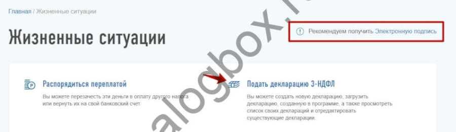 - затем нажать кнопку справа «Подать декларацию» и выбрать пункт «Заявить доход», «Получить вычет» или «Подать декларацию 3-НДФЛ»;