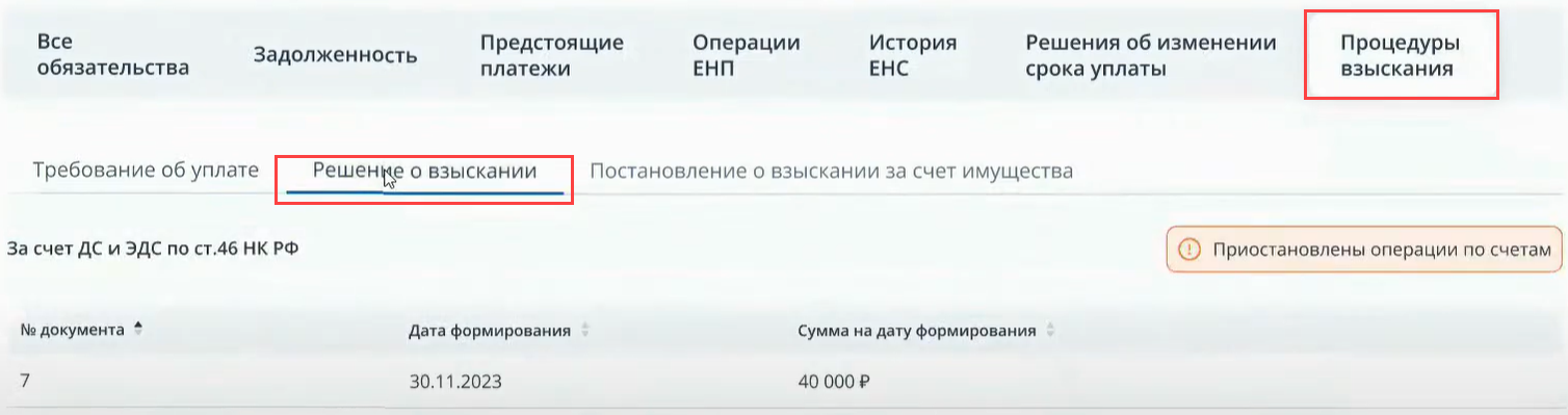 С главной страницы интерфейса ЕНС можно перейти к списку Процедуры взыскания. Далее посмотреть информацию в разрезе сформированных: