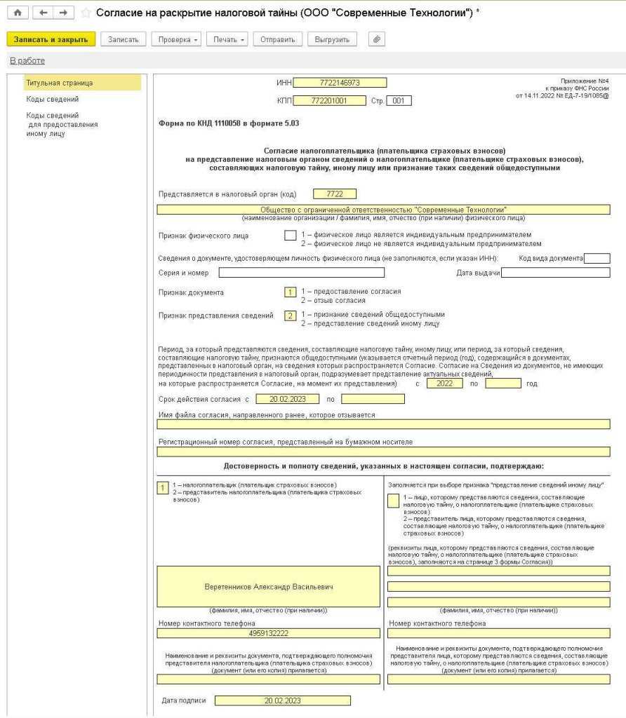 В программах системы «1С:Предприятие 8» форма и формат направления согласия налогоплательщика (плательщика страховых взносов) на предоставление сведений, составляющих налоговую тайну по Приказу № 1085 поддержаны.