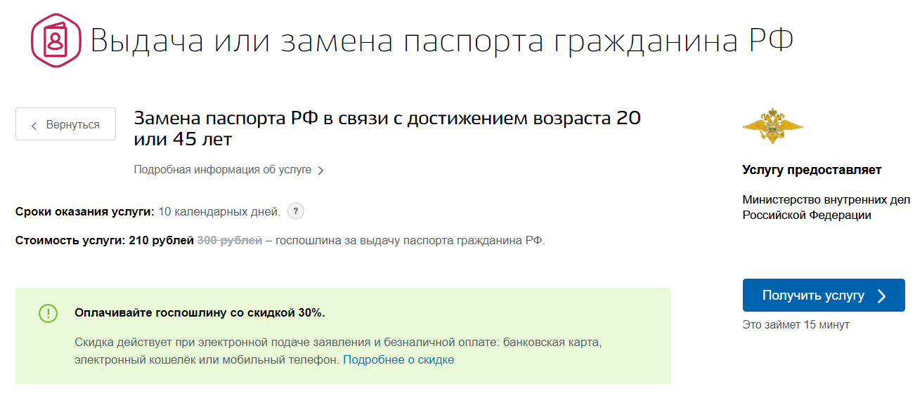 При дистанционной оплате госпошлины гражданину предоставляется скидка в 30%. Например, замена паспорта через Госуслуги по причине достижения 45 лет будет стоить 210 рублей вместо 300 стандартных. При оплате наличными в банках берется полная сумма без скидки.