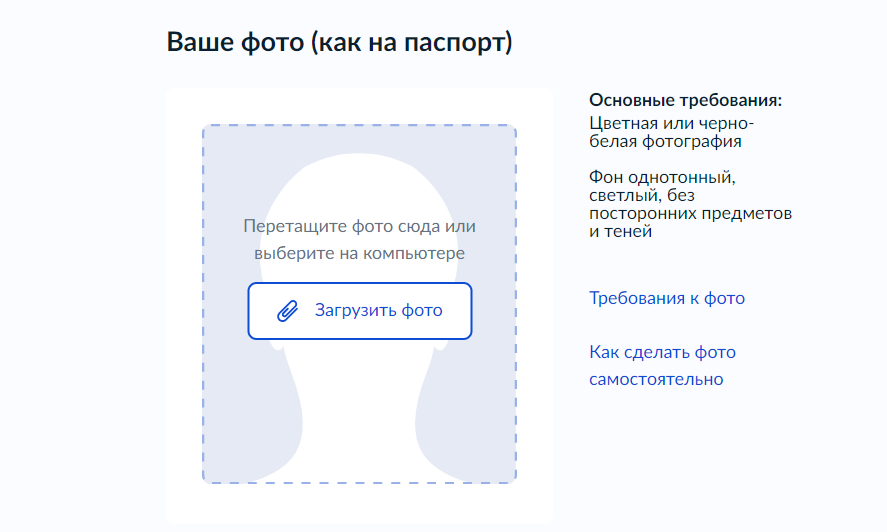 Требования к фото на паспорт Госуслуги Как загрузить фото в Госуслуги на паспорт? Это делается предельно просто, необходимо нажать на кнопку «Загрузить фотографию» и выбрать нужное фото на компьютере.