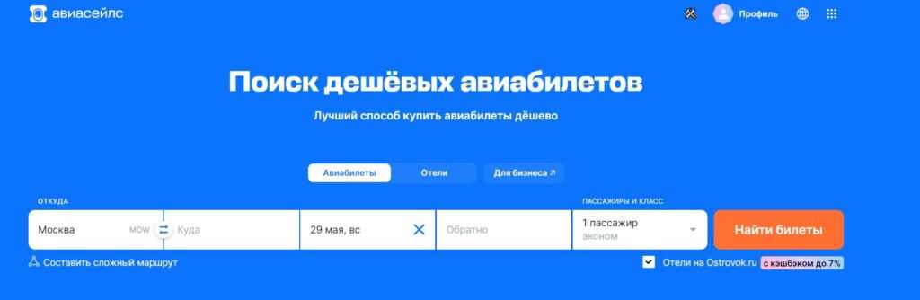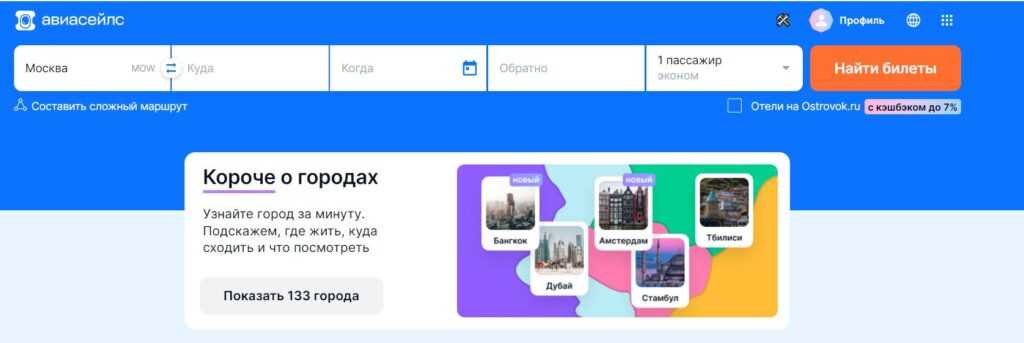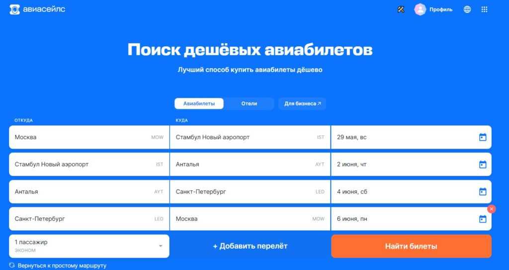 Если вы хотите сразу построить маршрут из нескольких городов, воспользуйтесь опцией «Сложный маршрут». Кнопка находится в левом нижнем углу, под окном поиска. Она позволяет выстроить маршрут из шести перелётов.