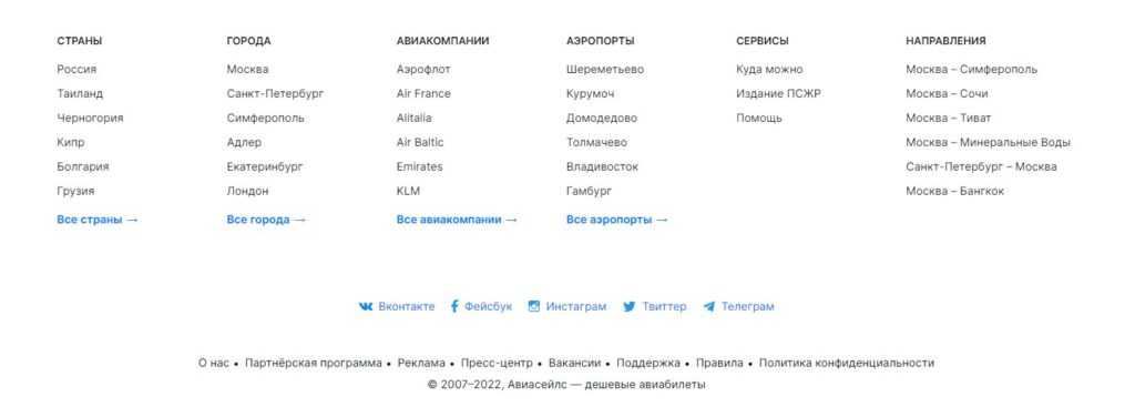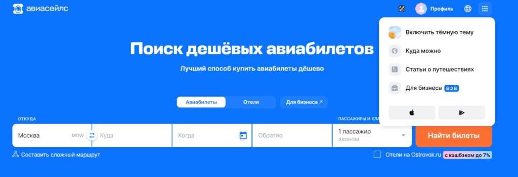 В правом верхнем углу есть кнопка входа в личный кабинет, меню и опция изменения валюты. Через меню вы легко перейдёте в карту низких цен, в издание про путешествия ПСЖР (кстати, вы уже здесь!) и Авиасейлс для бизнеса.