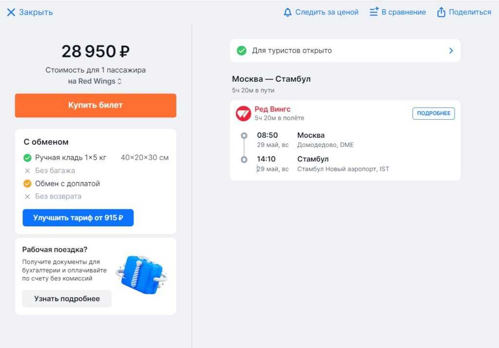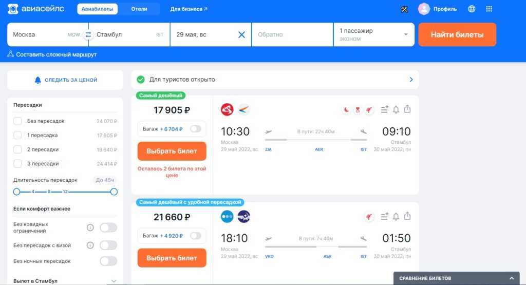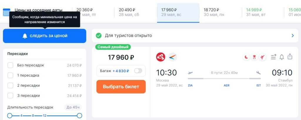 Помимо выбора конкретного маршрута, например, Санкт-Петербург — Стамбул, во время пандемии на Aviasales появился вариант “Куда можно”, где показаны все направления, открытые для туризма. При желании можно “подписаться на цену”, чтобы получать уведомления, если стоимость перелета станет ниже.