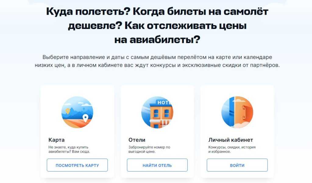 Ещё ниже — опции, о которых уже говорили: карта низких цен, отели и личный кабинет.