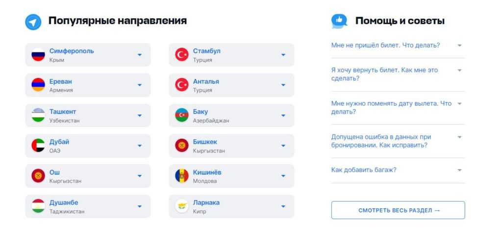 Помимо главного, поисковика билетов, вы найдёте на основной странице много интересного.