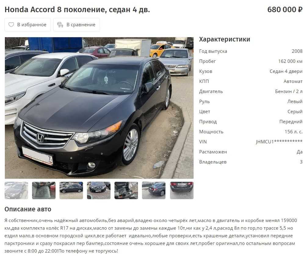 Вот, например, продается Honda Accord 8 поколения. Аварий, по словам продавца, нет, пробег оригинальный.