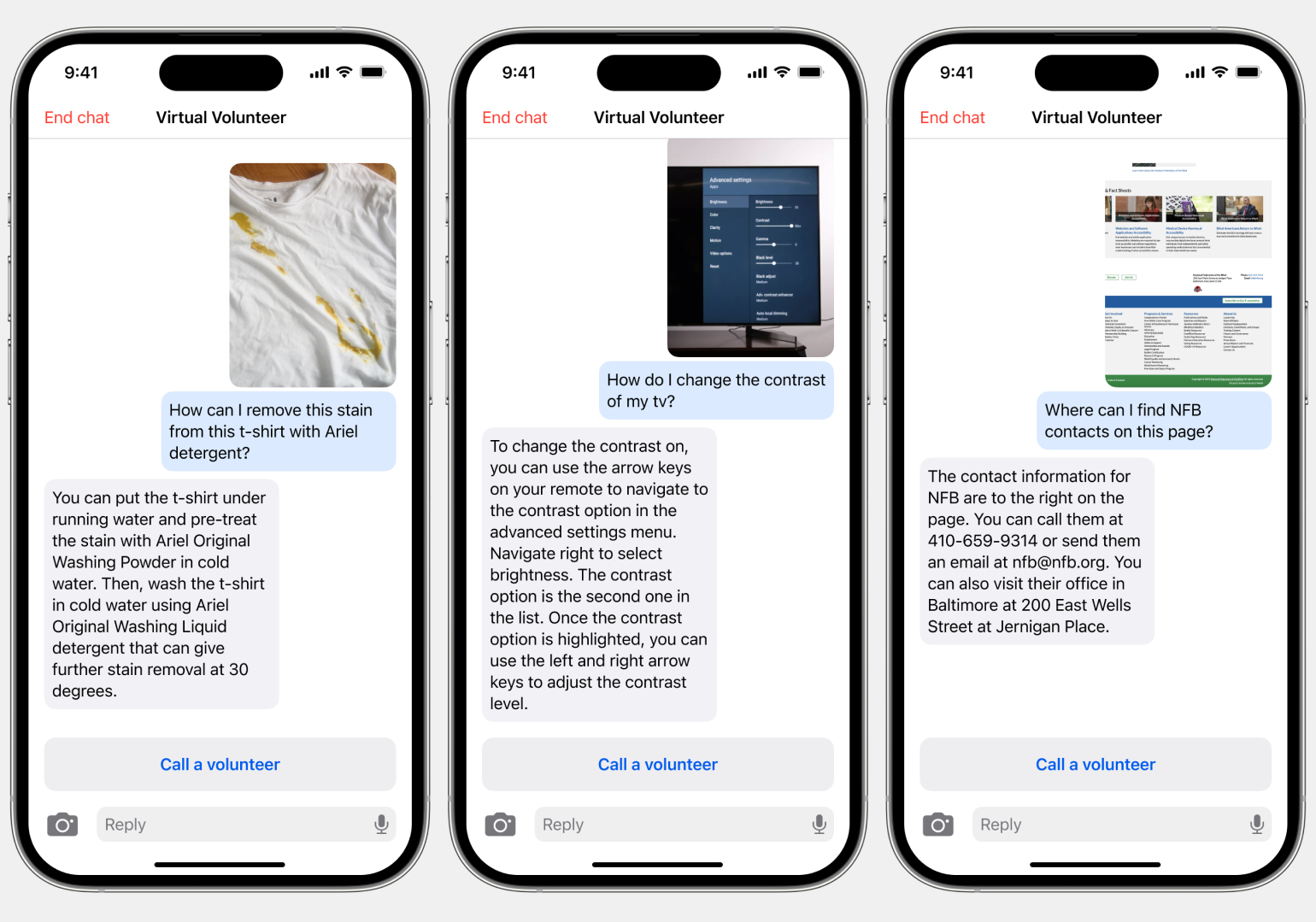 Примеры работы функции «Виртуальный волонтёр»: приложение помогает при стирке белья, настройке телевизора и поиске контактов на интернет-страничке Изображение: Be My Eyes