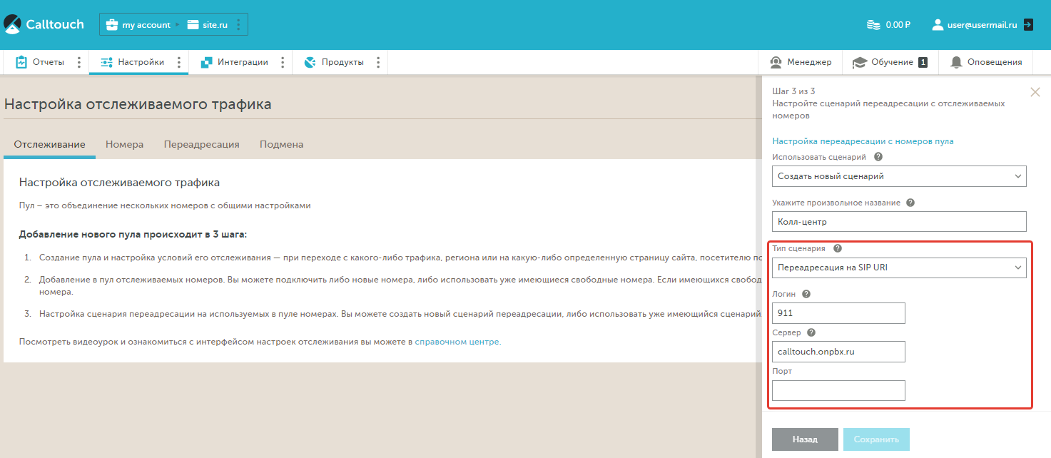 В опции «Тип сценария» выберите значение «Переадресация на SIP URI». В этом случае для переадресации будет использоваться существующий SIP-сервер на Вашей АТС, переадресация звонков на который будет реализована через адрес SIP URI в формате user@server. Пример SIP URI адреса: 911@calltouch.onpbx.ru.