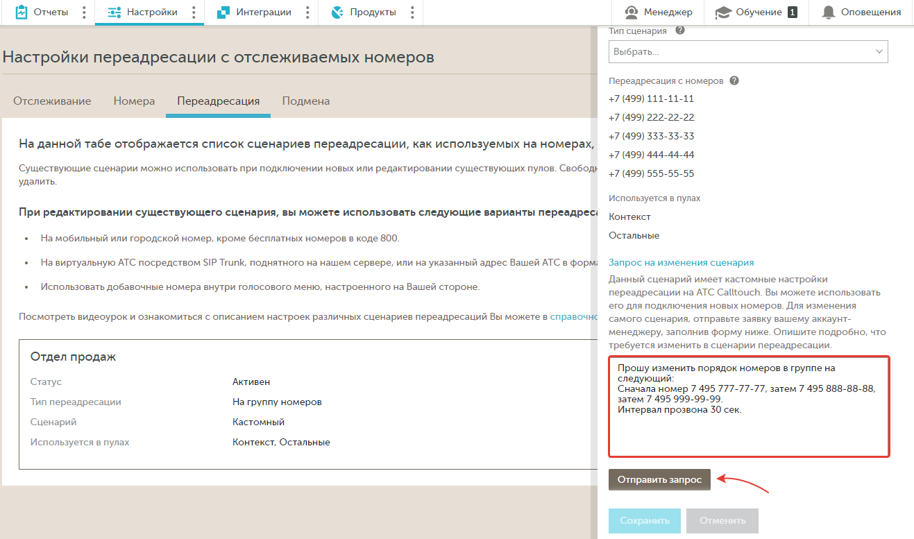 Кастомные сценарии можно точно так же назначать номерам, как и простые сценарии. Ограничено только создание и редактирование таких сценариев. Создать и отредактировать кастомный сценарий можно по запросу к вашему аккаунт-менеджеру Calltouch или в техническую поддержку info@calltouch.net. Запрос на редактирование уже настроенного кастомного сценария также можно отправить напрямую из интерфейса: