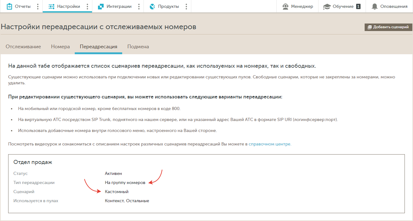В интерфейсе доступно описание типа переадресации, за подробным пояснением как именно настроен такой сценарий обратитесь к вашему аккаунт-менеджеру Calltouch или в техническую поддержку info@calltouch.net.