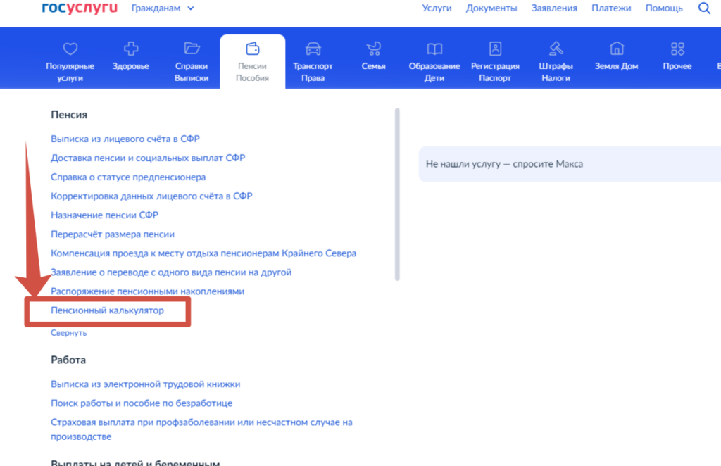 На портале «Госуслуг» необходимо перейти в «Пенсионный калькулятор». Он вас сразу перенаправит на нужную страницу СФР. Этот переход можно сделать через поискового робота Макса.