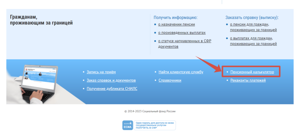 Через сайт СФР можно зайти в личный кабинет электронных услуг и долистать все меню до самого конца. Внизу страницы и окажется пенсионный калькулятор: