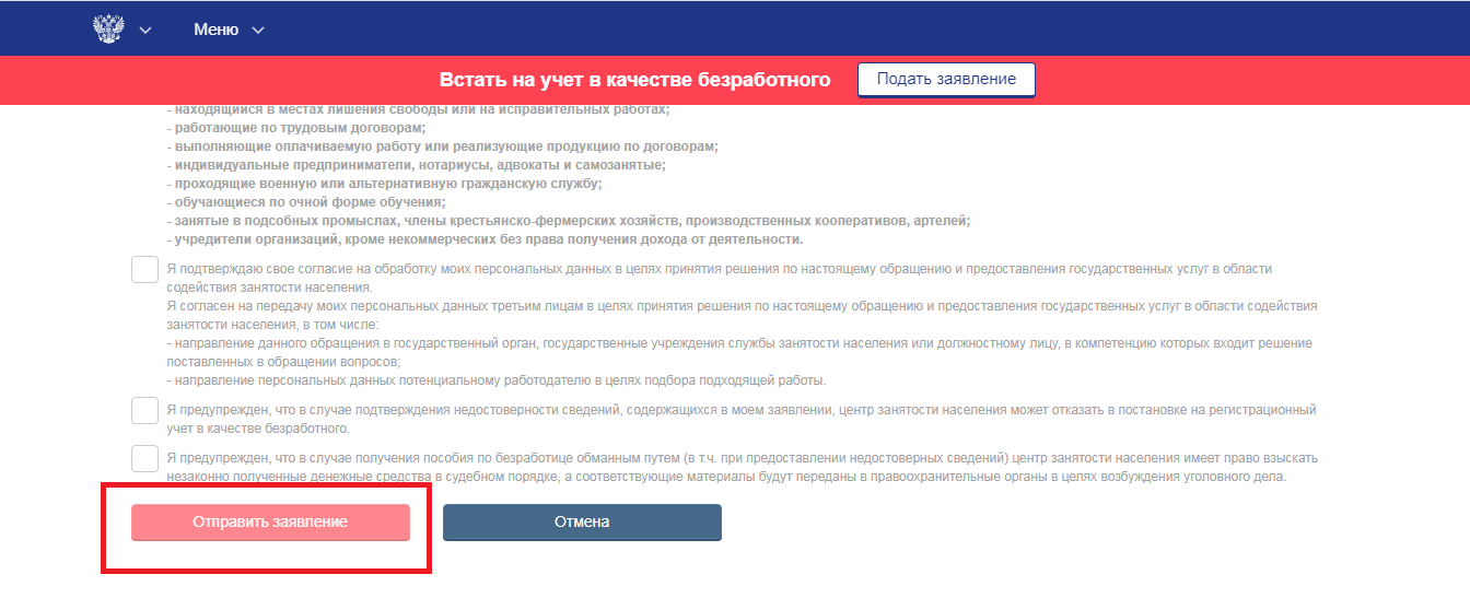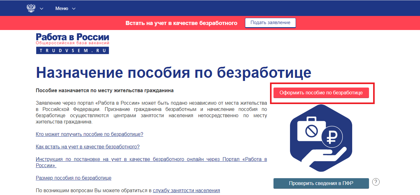 - Найдите в меню кнопку «Оформления пособия по безработице».