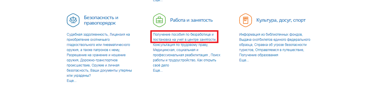 Шаг 2. Найти раздел «Работа и занятость» и выбрать в нем услугу «Получение пособия по безработице и постановка на учет в центре занятости».