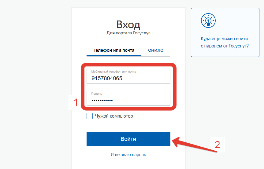 - Заходят на сайт gosuslugi.ru. Авторизуются, используя в качестве логина мобильный телефон, указанный при регистрации или номер СНИЛС.