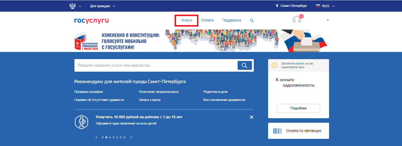Шаг 1. Зайти на сайт госуслуг, авторизоваться на нем и на главной странице перейти во вкладку «Услуги».