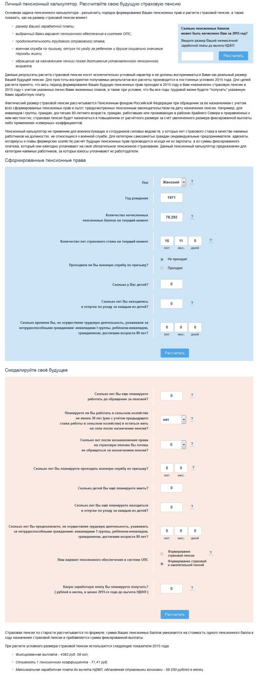 д) По данной ссылке располагается персонифицированный пенсионный калькулятор, с помощью которого можно смоделировать своё пенсионное будущее на основе уже заработанных баллов и учтённого стажа (в том числе нетрудового). Также можно посчитать количество пенсионных баллов, которые Вы можете заработать в 2015 году.