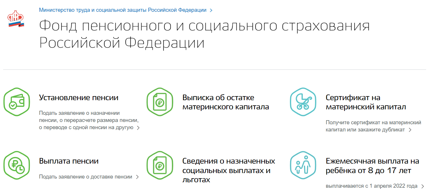 У Фонда Пенсионного и социального страхования Российской Федерации есть и своя отдельная страница на Госуслугах, где отображены все возможные действия. Ссылка на этот подраздел находится в разделе Органы власти: