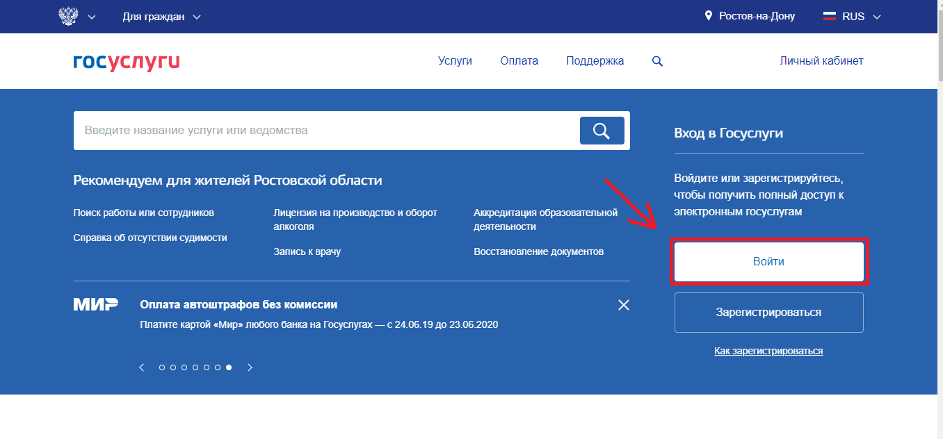 Чтобы войти в личный кабинет – авторизуйтесь. На главной странице портала с правой стороны найдите кнопку “Войти”.