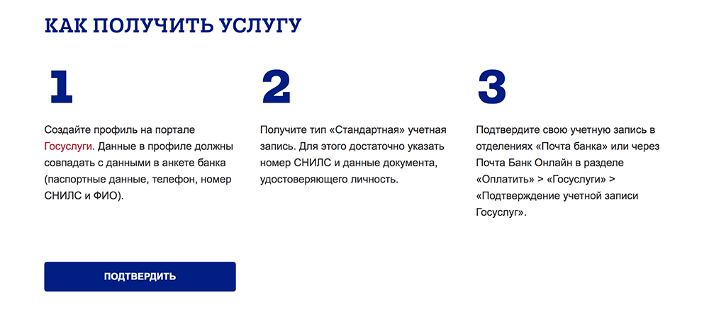 - Воспользуйтесь онлайн-банкингами Почта Банка, Сбербанка или банка Тинькофф. Найдите услугу подтверждения или регистрации личного кабинета, сверьте паспортные данные и подтвердите аккаунт, не выходя из дома.
