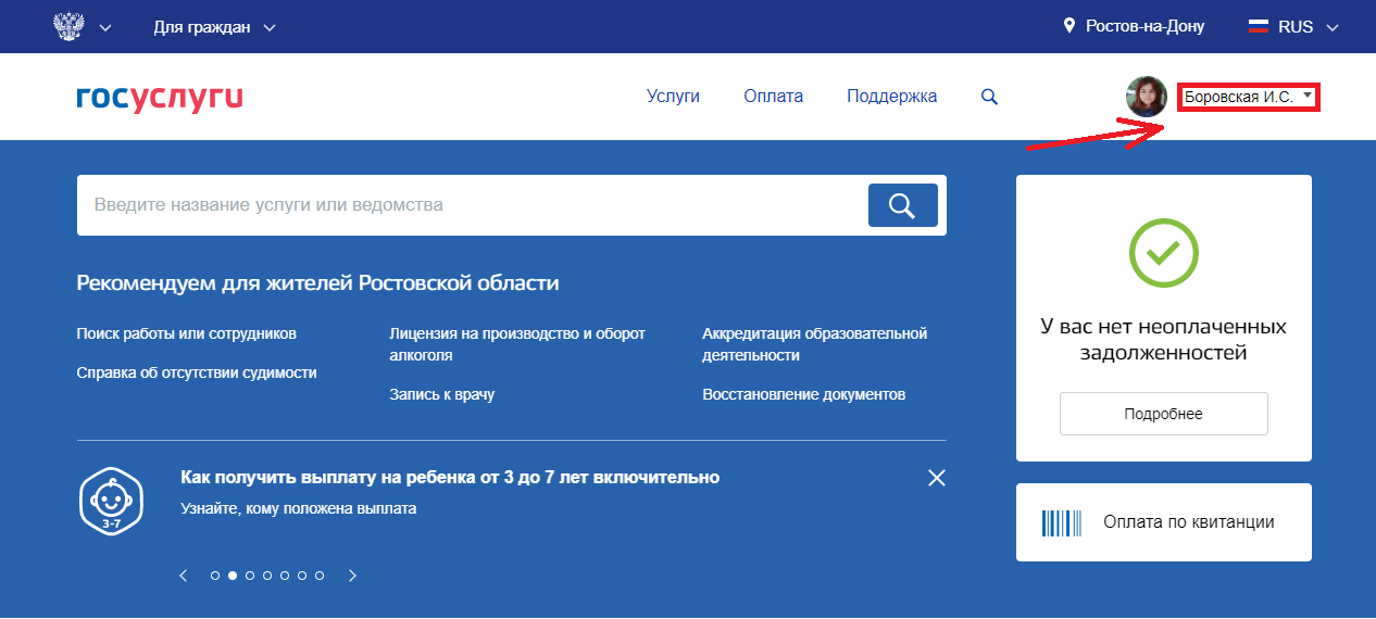 На главной странице госуслуг кликните на свою фамилию в правом верхнем углу.
