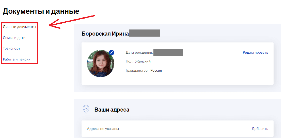 В списке, который появится, найдите разделы “Документы и данные” и “Настройки и безопасность”. В первом находятся основные сведения о вас, ваших детях и транспортных средствах (при наличии). Во втором – контактная информация.