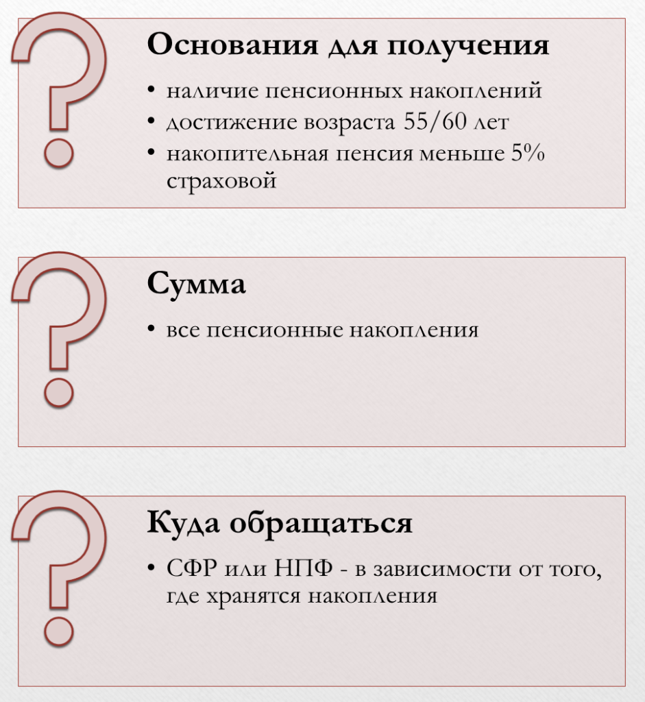 Претендовать на единовременную выплату могут граждане, у которых есть пенсионные накопления, и по которым выполняется хотя бы одно из вышеперечисленных условий.