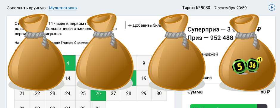 Стоимость четырех таких ставок при сумме билета в 80 рублей будет равняться 40 320 рублям при гарантированном выигрыше равном 80 рублей.