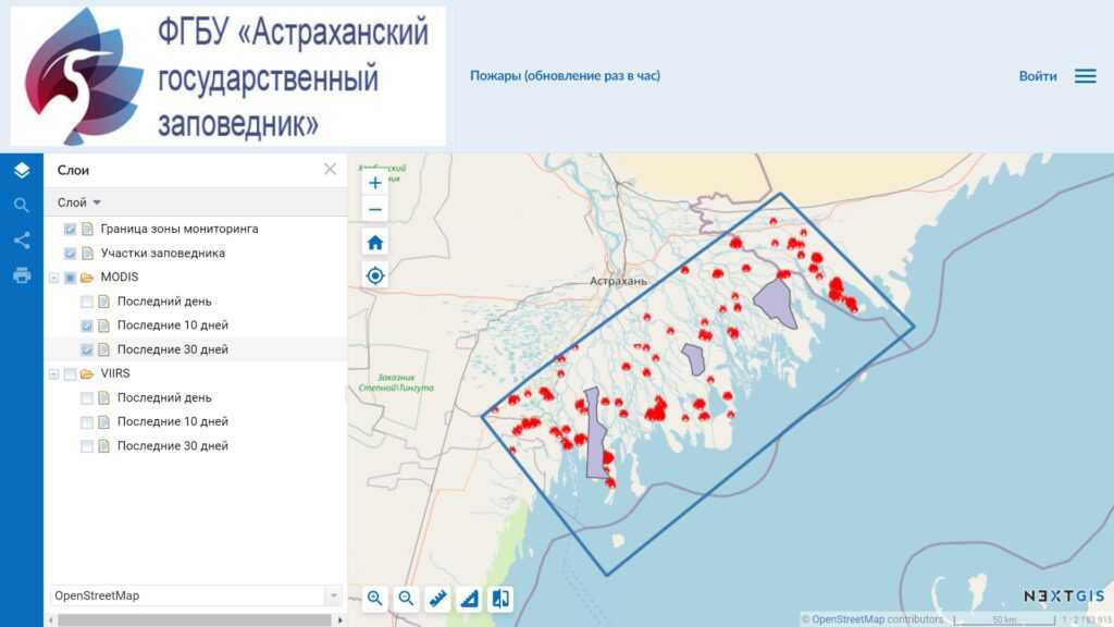 Использование сервиса в ООПТ позволяет не только выявлять природные пожары для оперативных задач, но и отслеживать их динамику. Данные обновляются каждый час и накапливаются для истории и последующего анализа.