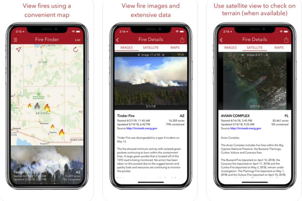 С помощью приложения Fire Finder вы можете легко искать информацию и изображения любого лесного пожара в США. Оно отображает очаги пожара на спутниковой карте и позволяет вам искать пожар, за которым вы хотите следить. Он отображает места пожаров и данные о периметре пожаров, имеет общую фотогалерею и предоставляет информацию о пожарах из множества государственных и федеральных источников, таких как InciWeb и Cal Fire.