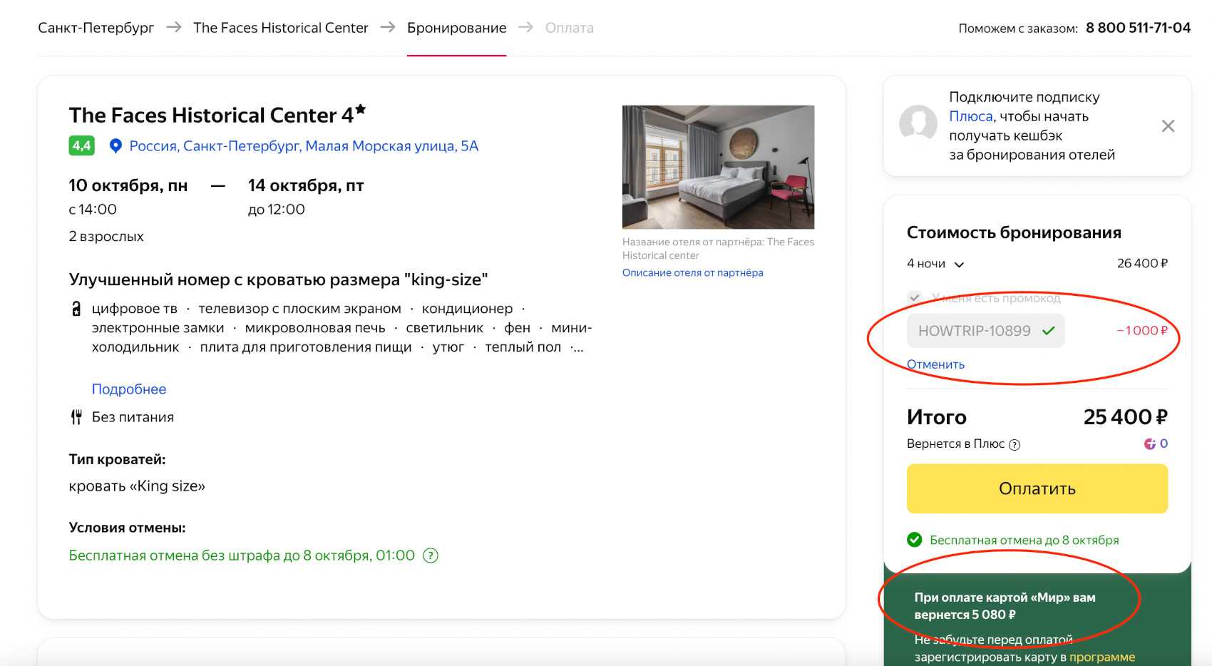 Вот, например, на самый красивый отель в Петербурге — The Faces Historical Center — можно получить максимальную скидку благодаря кешбэку