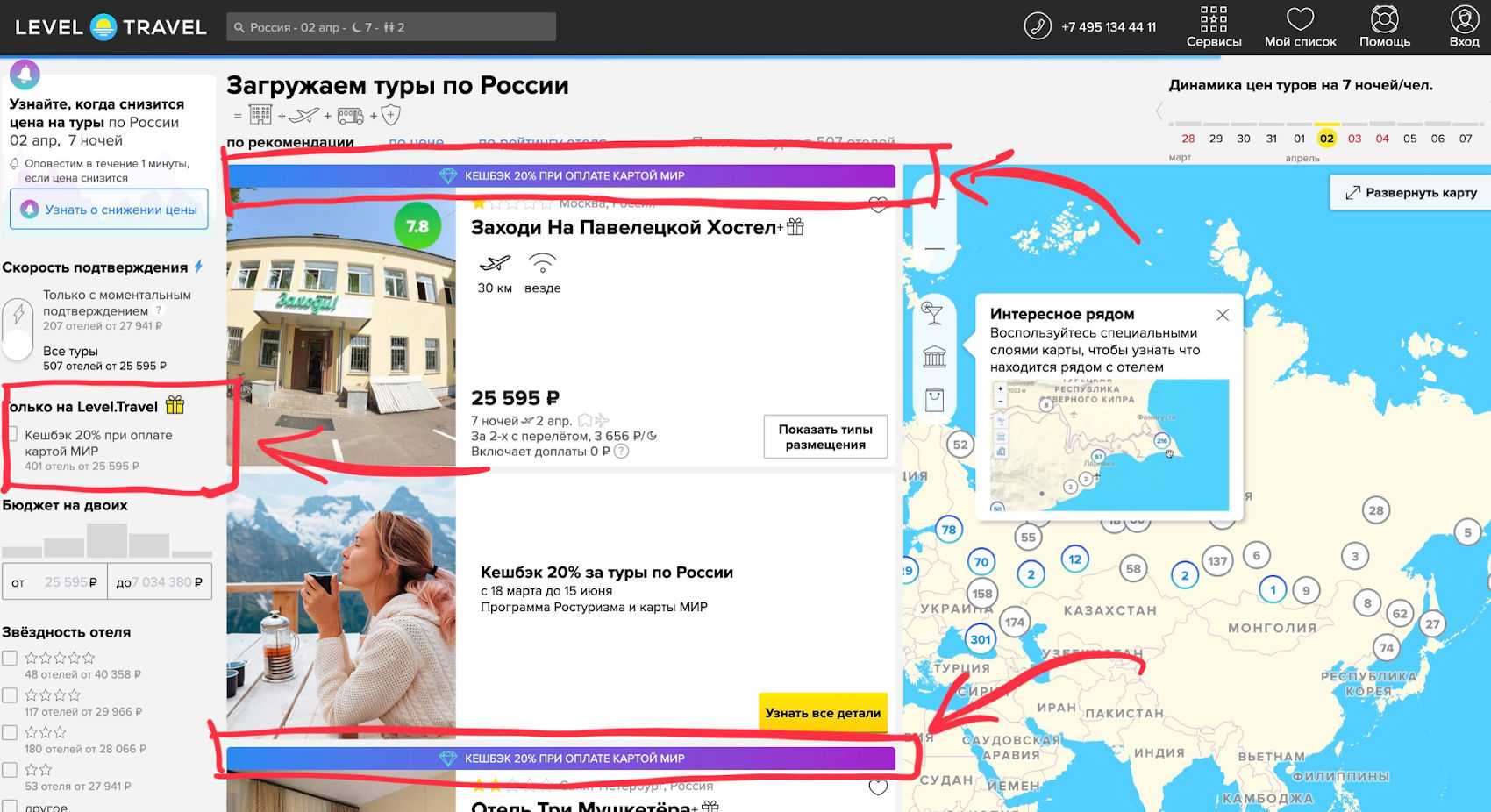 На поисковике туров Левел Тревел справа есть фильтр «Кешбэк 20%», а туры/отели помечаются фиолетовым или красным цветом