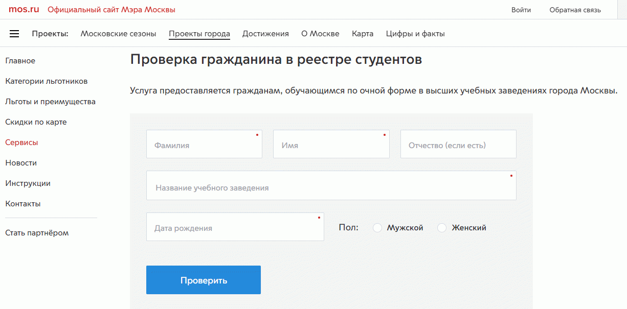 - Онлайн-проверка через «сайт мэра Москвы». Необходимо выбрать в меню «Проекты города», найти «Социальная карта». Выбрать раздел «Социальная карта», нажать «Проверка состояния изготовления социальной карты». В окне ввести данные в поля «Номер заявки» и «Номер документа».