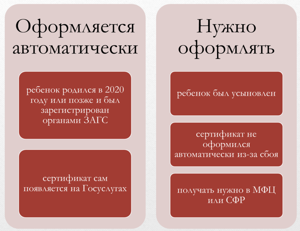 По общему правилу, действующему с апреля 2021 года, заявление на получение не требуется, сертификат оформляется автоматически на основании данных, полученных из ЗАГСа. По истечении отведенного времени документ должен появиться в личном кабинете матери или отца на сайте Госуслуг.