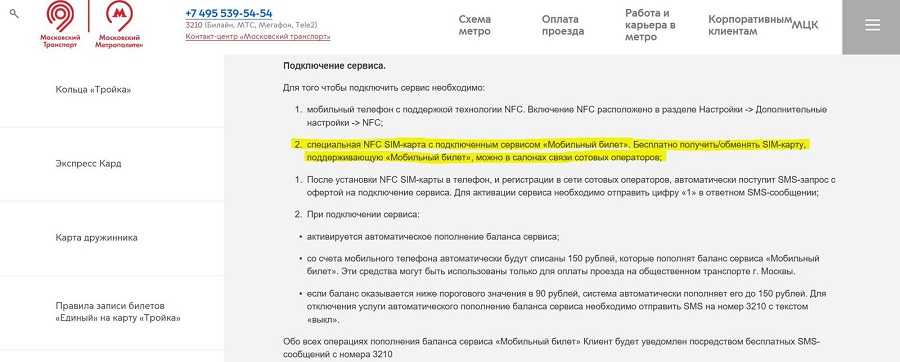Чтобы стало возможным использовать транспортную карту Тройка через NFC на Андроиде, целесообразно настроить сервис «Мобильный билет» и произвести привязку карточки. Тут придется приобрести симку с НФС, на которой и настраивается услуга. Она предоставляется такими мобильными операторами: