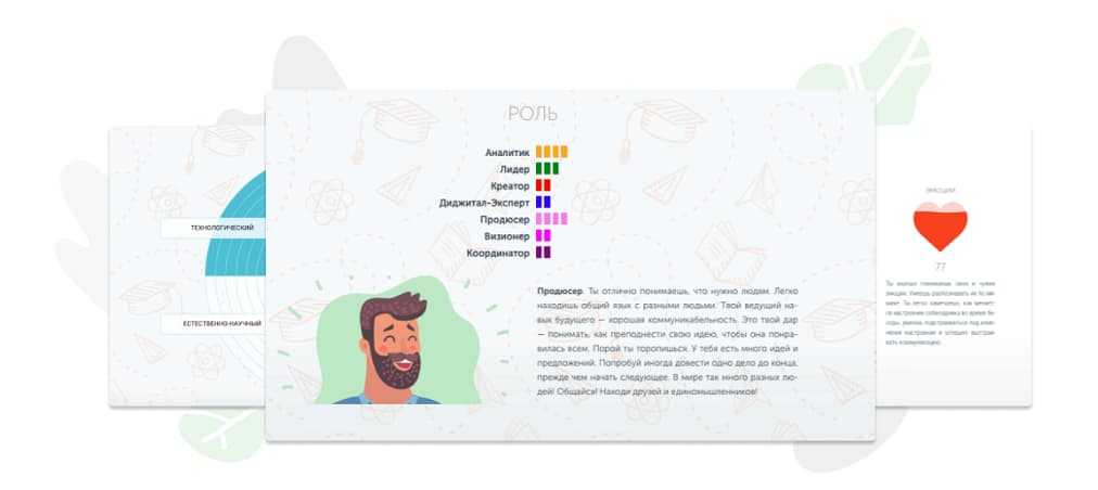 Результат покажет тип личности и распишет все сильные стороны и предпочтения. Ещё тест подберёт профессии будущего и подробно расскажет про них. Можно узнать, чем занимается продюсер смыслового поля или science-художник.